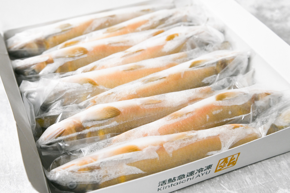 当組合の施設内で養殖された食用に適したサイズの鮎について、〆アユ(7月ごろ季節限定)、冷凍アユを取り扱っております。